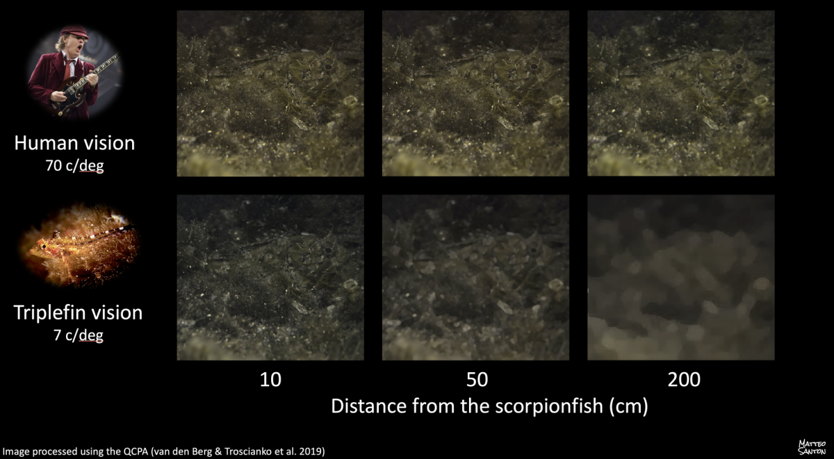 During my PhD I focussed on the visual interaction between a small marine fish, the yellow black-faced triplefin Tripterygion delaisi, and one of its common cryptic predators, the black scorpionfish Scorpaena porcus. The research approach first aimed at better understanding the visual perspective of a triplefin when facing its predator, and then behaviourally and theoretically testing a new form of active sensing in the context of this prey-predator interaction. My methods included large behavioural experiments in the field with SCUBA, underwater spectrometry, calibrated photography, visual modelling and advanced biostatistics.